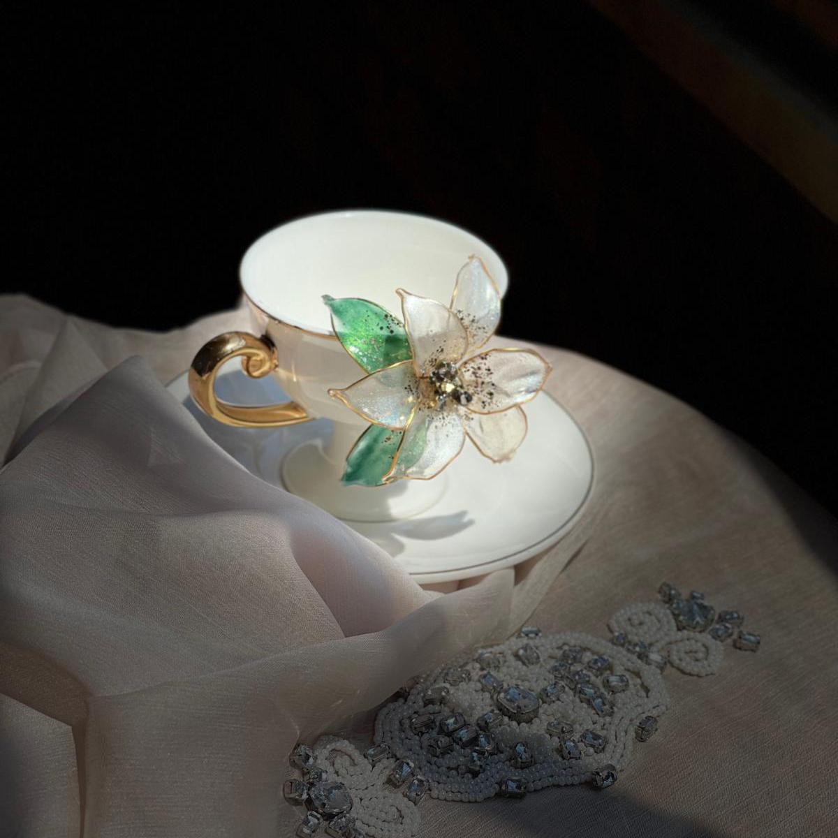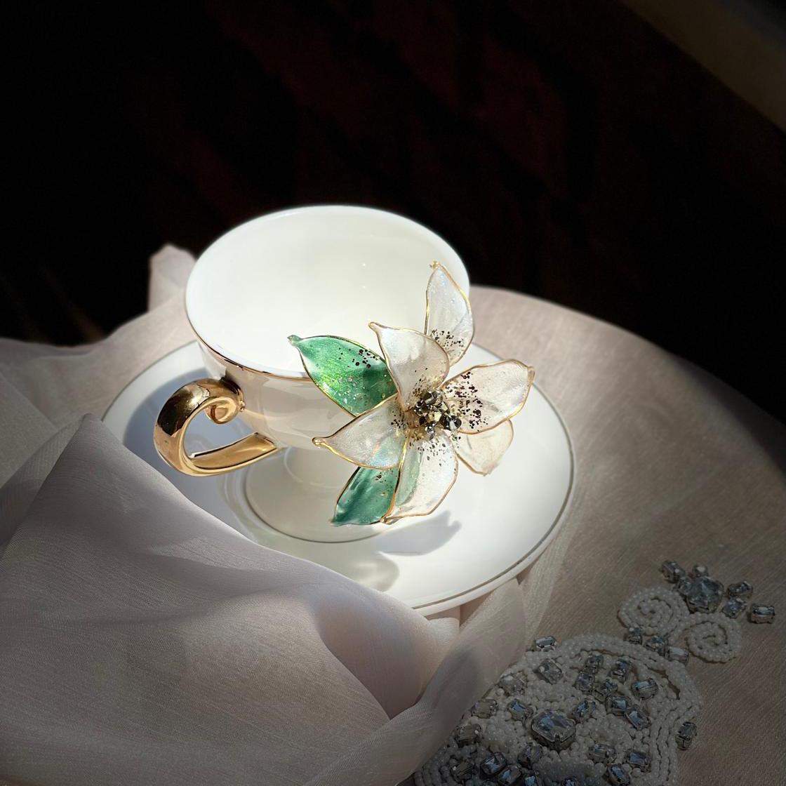 Çeyiz, özel gün ve hediye için ideal olan bu özel tasarım reçine çiçekli fincanlar zarafet ve kaliteyi bir araya getirir.